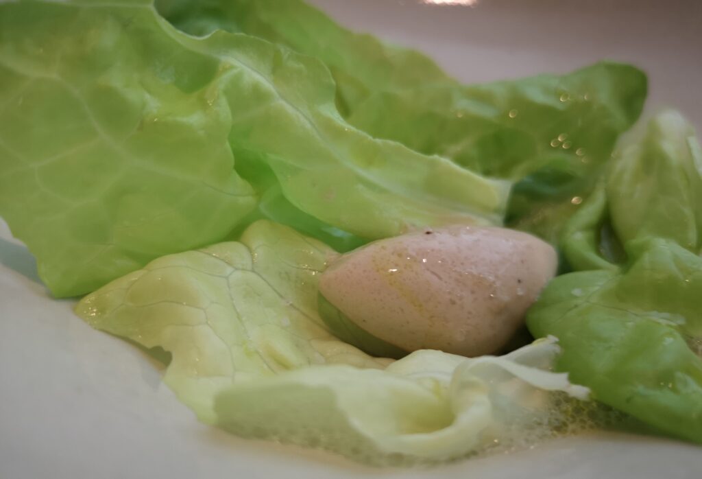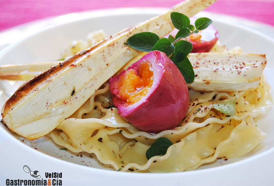 Mafaldine con chirivía asada y huevo púrpura