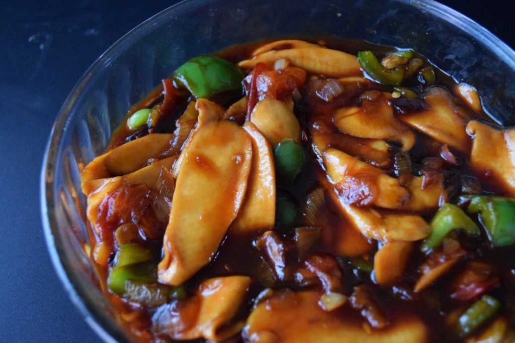 En lugar de pollo, utilizo un hongo notable llamado Eryngii, también conocido como Champiñón Rey. Originario del Norte de África, Oriente Medio y el Mediterráneo, y ahora cultivado comúnmente en Asia, este hongo debe su popularidad a su textura firme pero jugosa, casi similar a la grasa, que puede dorarse como la carne, combinada con una habilidad infalible para absorber sabores.